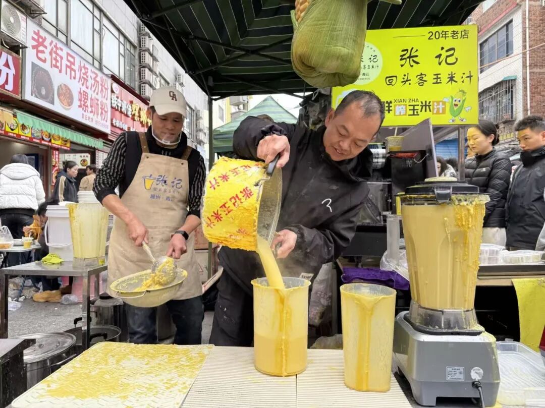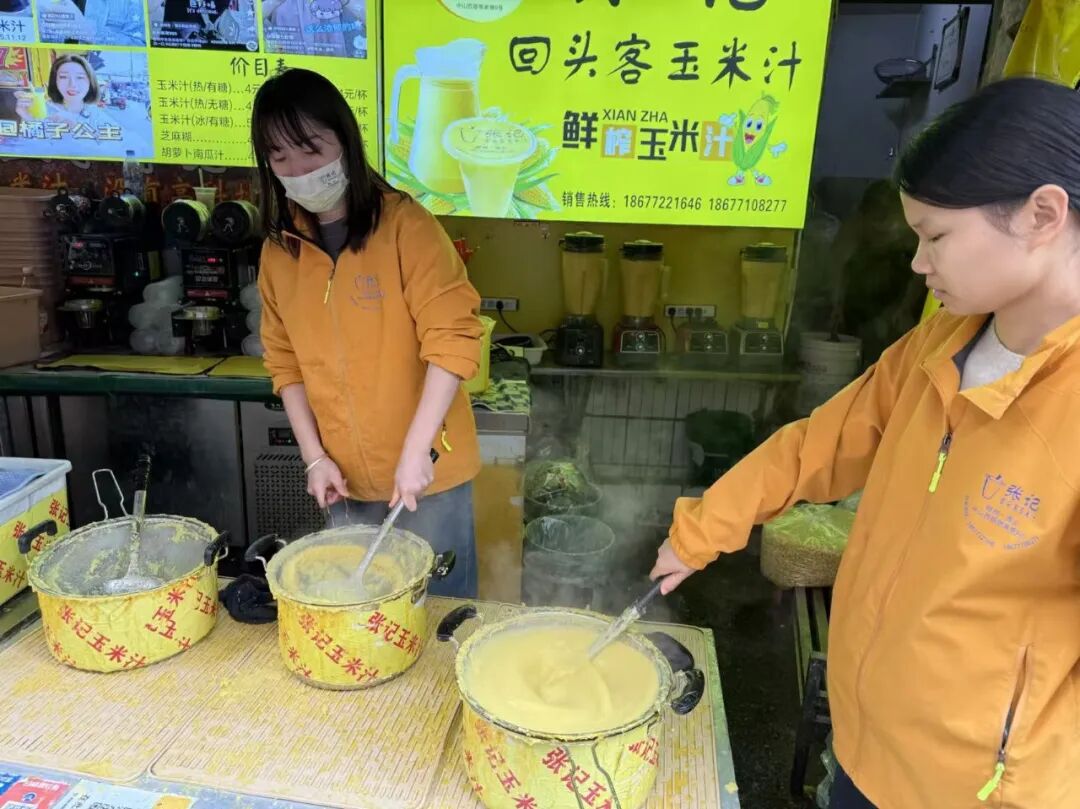 店家也是忙得不亦乐乎。玉米汁店几名店员忙着把打好的玉米汁滤渣,用汤勺不断拌和。