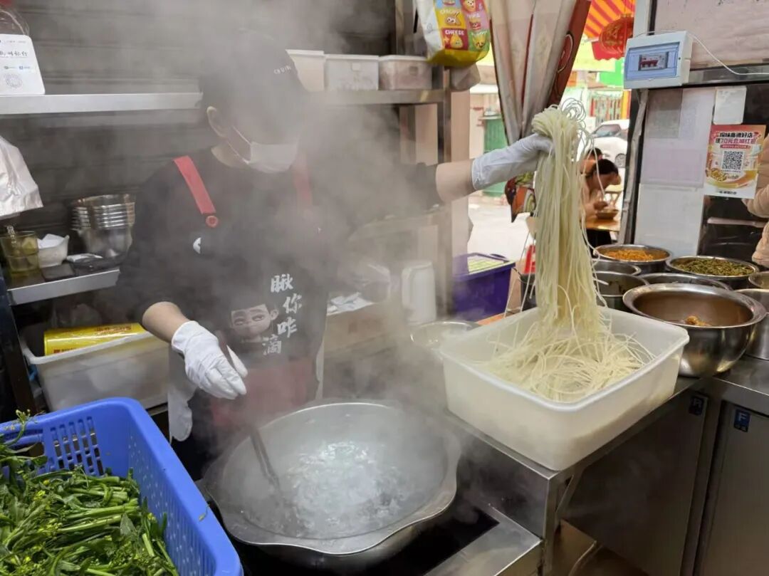而在广雅路北四巷的一家柳州螺蛳粉店,几名店员分工合作,忙着为顾客煮粉打粉,只要汤锅换水的空档,才干略微歇息调整一下。